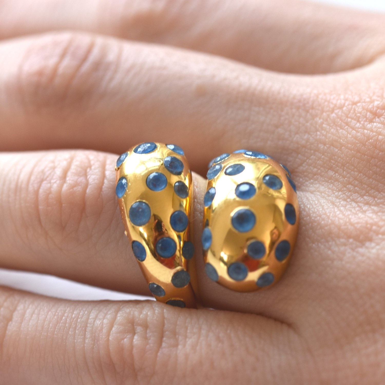 They note, “A fabulous shaped ring with two genereous curved hollow ‘domes’ at the front, joined by a narrow band at the back. The two domes are covered in large and small holes into which faceted blue quartz gemstones have been placed. The colour of the blue quartz is a wonderful light bright blue and there are about 40 faceted gemstones randomly placed on the domes. The width of the ring is 25mm. The metal is recycled .925 sterling silver with 2.5 microns of recycled 18k gold vermeil.”