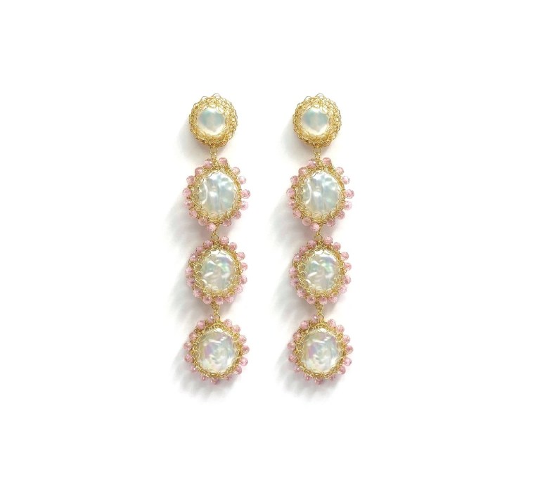 “The statement drop earrings have been constructed artfully with crocheted 14K recycled gold-filled wire and playfully strung dozen of mini soft pink cubic zirconia around a lustrous baroque freshwater pearl.This item’s approximate measurements are: Drop: 11cm Width: 2.5cm”