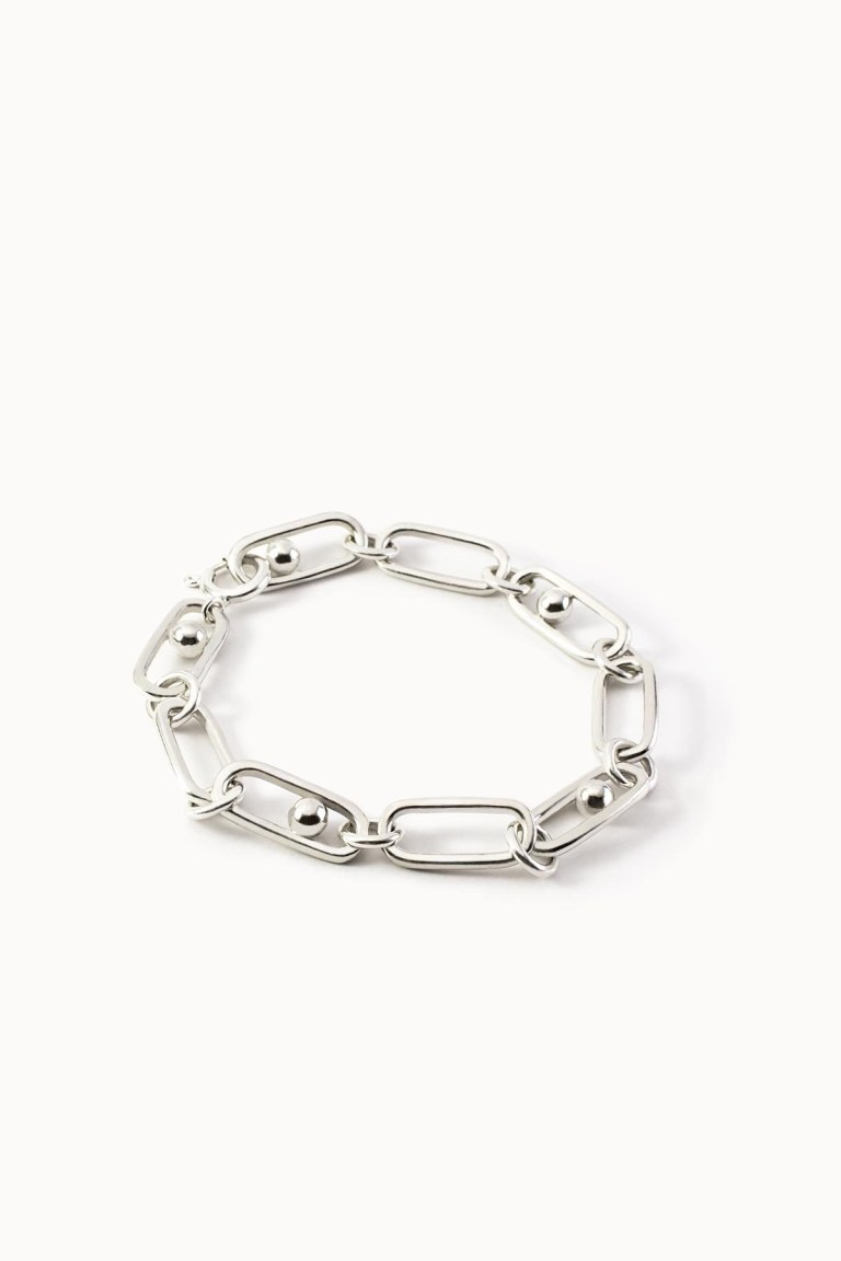 They note, “A chic and refined large link bracelet. Chain is composed of alternative links of oval and silver pearl shapes, for an urban style that does not go unnoticed.”