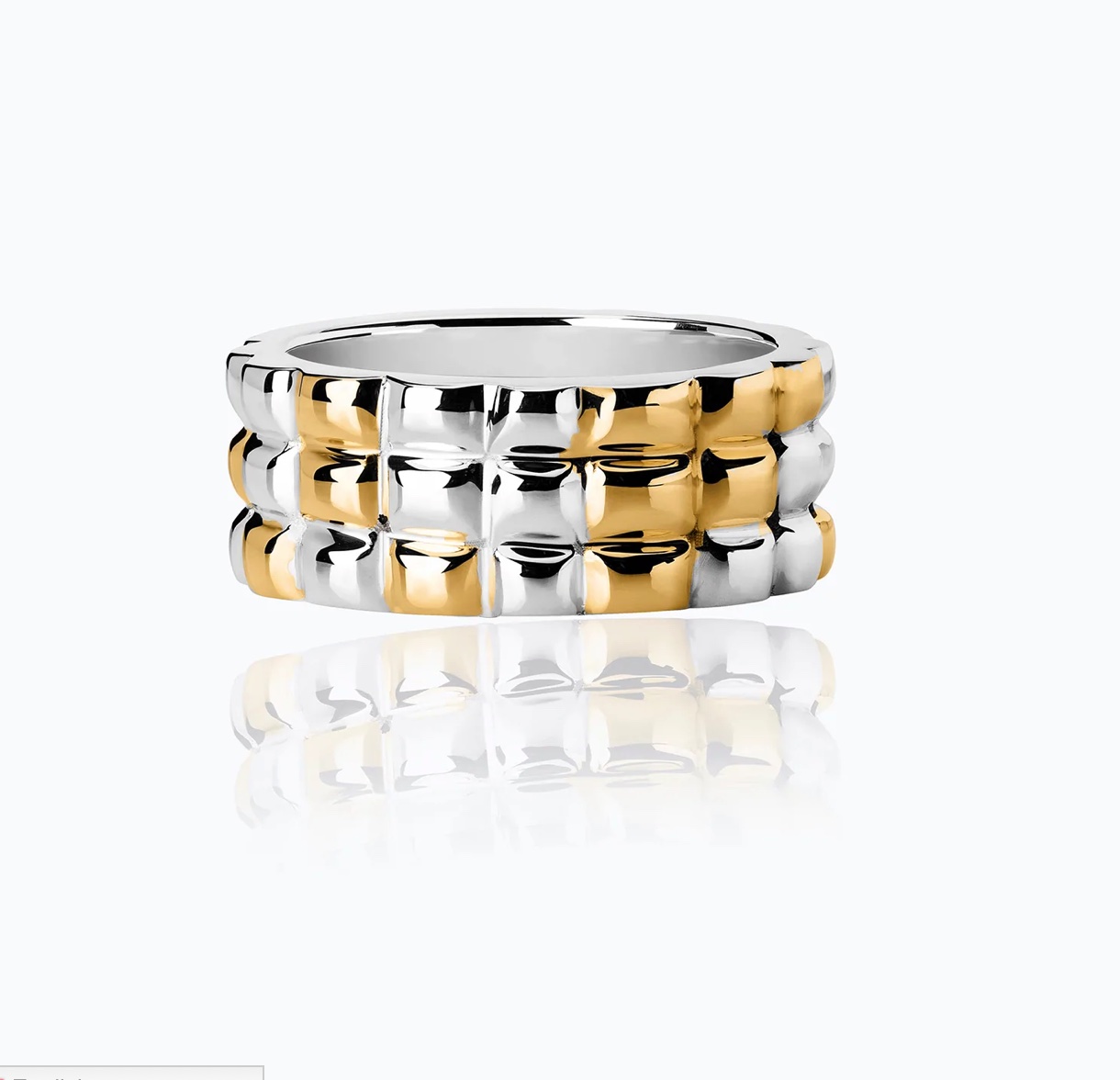 They note, “The Bicolor Vermeil Texture Alma Ring is made of sterling silver with 23 karat yellow gold vermeil. A ring completely covered by the texture of the collection, inspired by one of the most important symbols of Mexican identity. A tribute to the soul of Mexico: corn; this piece stands out due to the randomly applied yellow gold vermeil finish. Handmade in Mexico.”