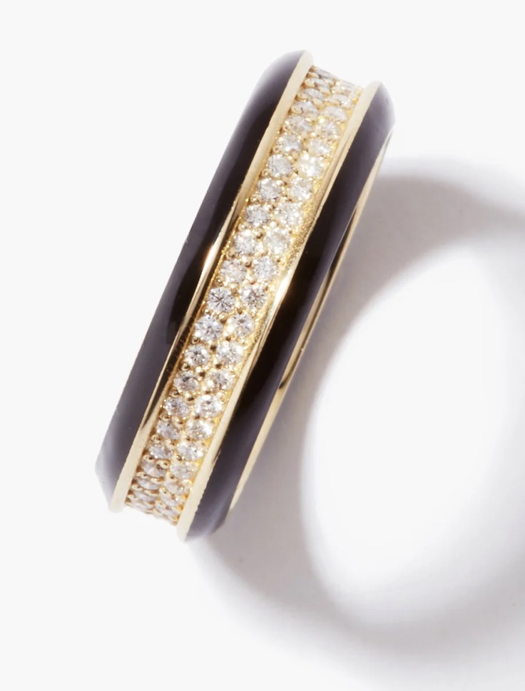 This ring by Lauren Rubinski is an elegant mix of enamel, diamonds and 14k yellow gold. The vendor’s description: Lauren Rubinski’s ridged ring is filled with contrasting black enamel stripes for striking contrast against the sparkling white brilliant-cut pavé-set diamonds. It’s handcrafted at the label’s Italian atelier from 14kt gold with a solid, pleasing feel, then engraved with the designer’s logo.