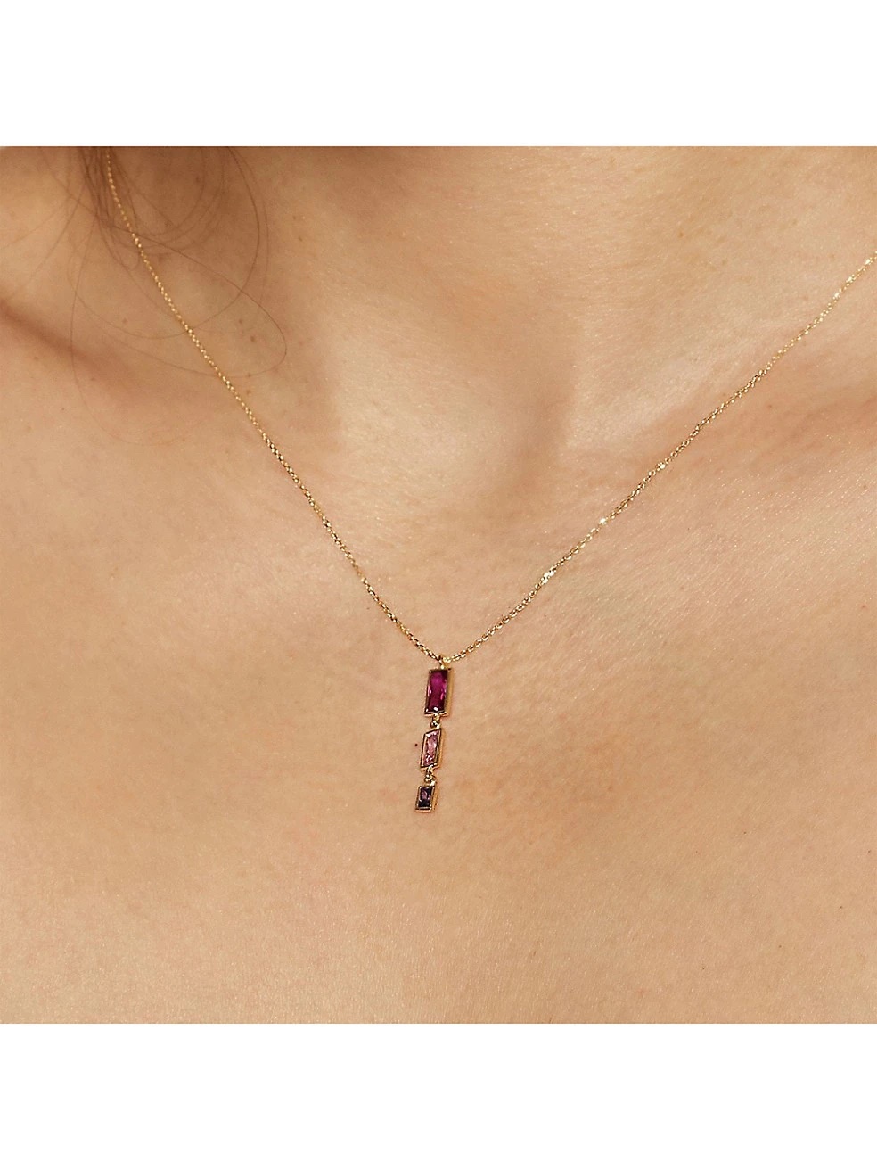 The piece is made of 14k yellow gold set with multicolour cubic zirconia stones. “Let your inner artist shine in our Fresco Pendant Necklace. Inspired by the vibrant colors of Italian murals, this necklace features three multicolored baguette Cubic Zirconia stones for a brilliant sparkle.”