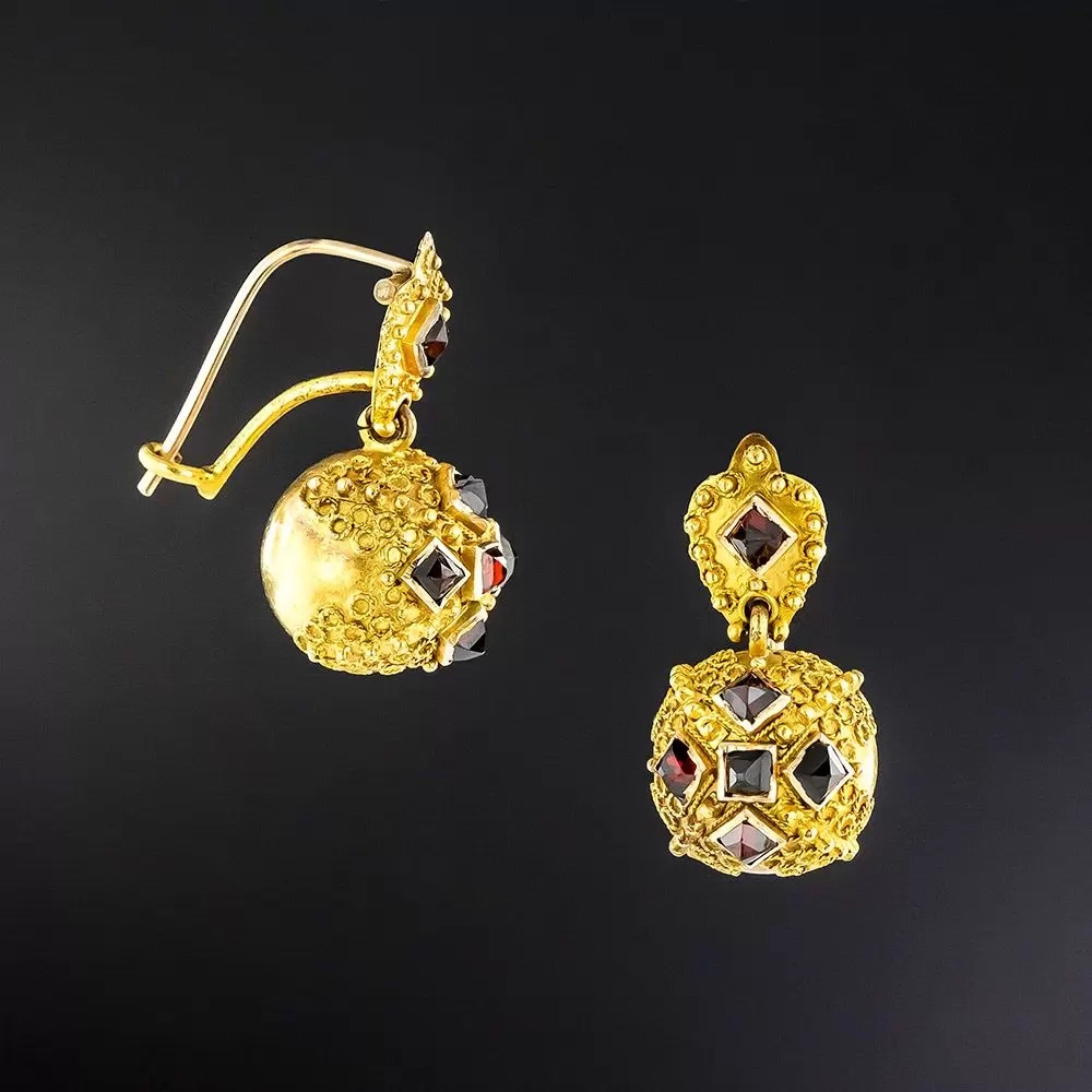 One of the things I appreciate about antique jewelry is that you are unlikely to see an piece identical to yours. These Victorian earrings are offered by Lang Antiques, who provide this description: Look what we have–darling little ornaments for your ears. Hand fabricated in 14K gold, these charming Victorian jewels (circa 1885) will add a bit of motion around your lobes by way of brightly burnished drops embellished with twisted wire appliques and granulation (tiny balls), while five glimmering deep red square-cut garnets create a colorful and striking pattern. The spherical works of art dangle beneath complementary bails, which connect to wire closures. Total garnet weight, 1.00 carat.