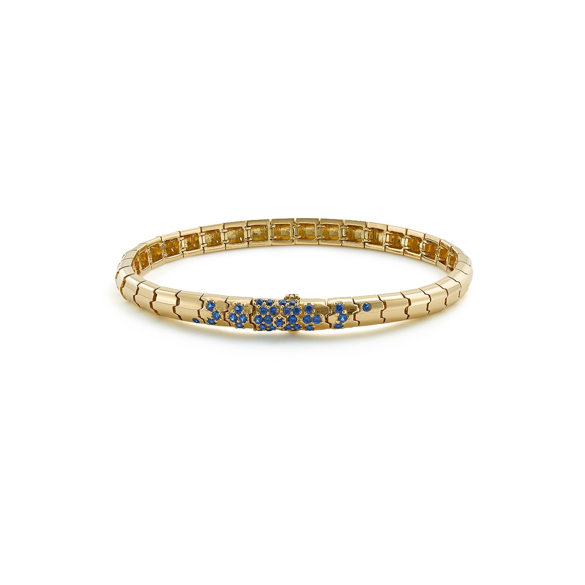 It is made of 24.41 grams of 18k yellow gold, set with .75 carats of blue sapphires scattered over the surface.