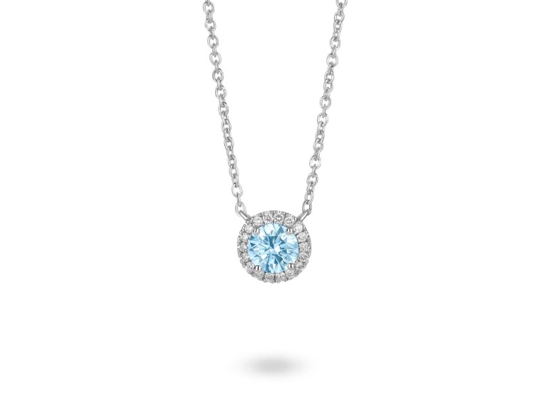 This halo pendant features one carat total weight, and comes with a fixed 14k chain. It’s also available with a pink or white centre stone.