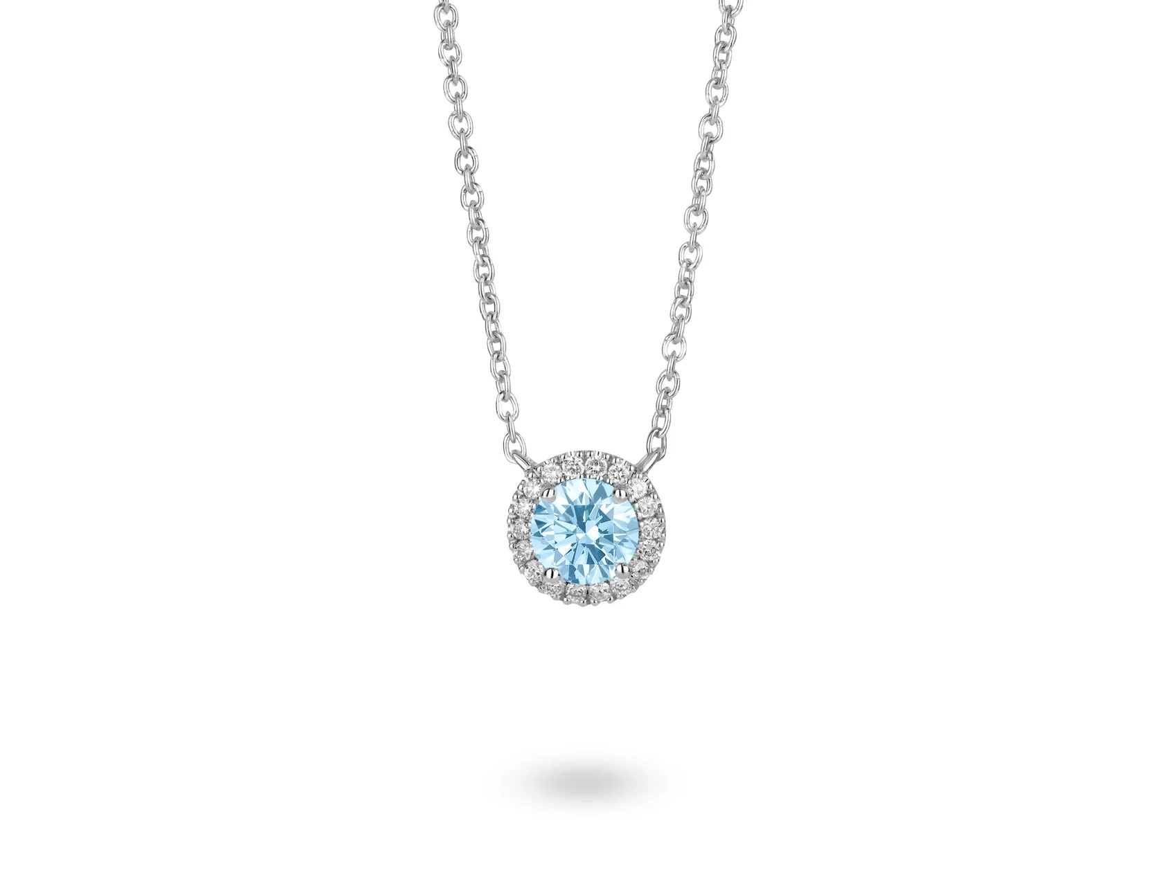 This halo pendant features one carat total weight, and comes with a fixed 14k chain. It’s also available with a pink or white centre stone.