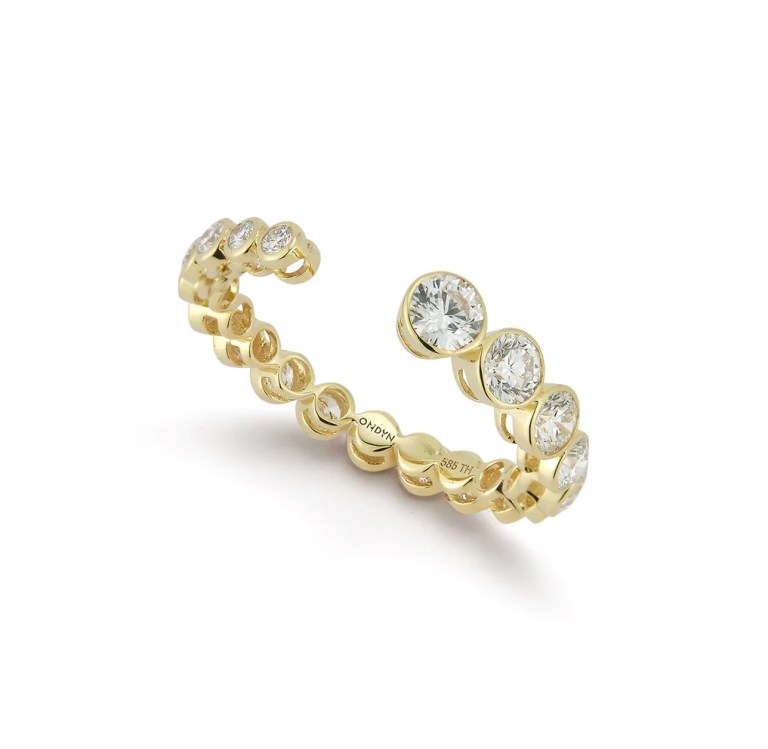 This ring from Ondyn is made with 14k yellow gold set with 1.35 carats of white diamonds.