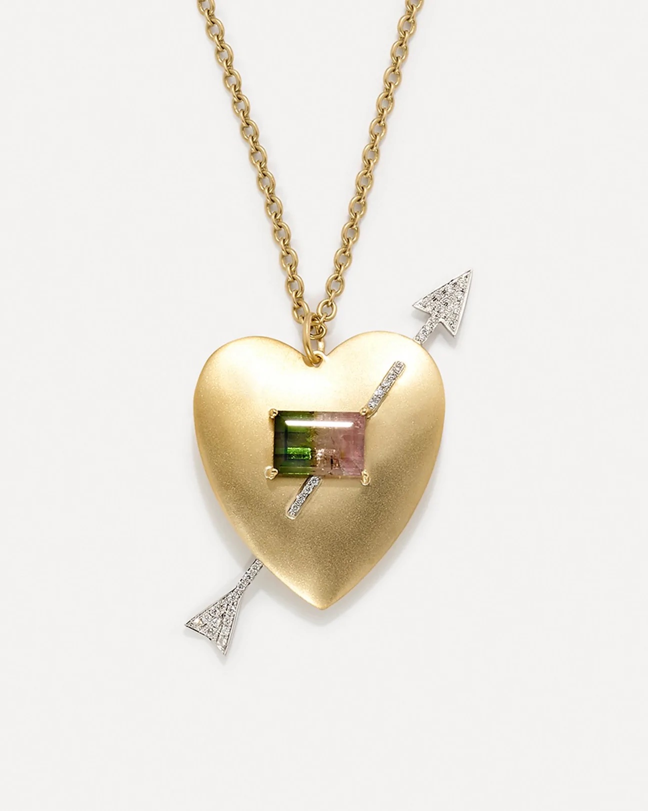 The heart shaped pendant is made with 18k gold, set with watermelon tourmaline and accented with a diamond pavé arrow.