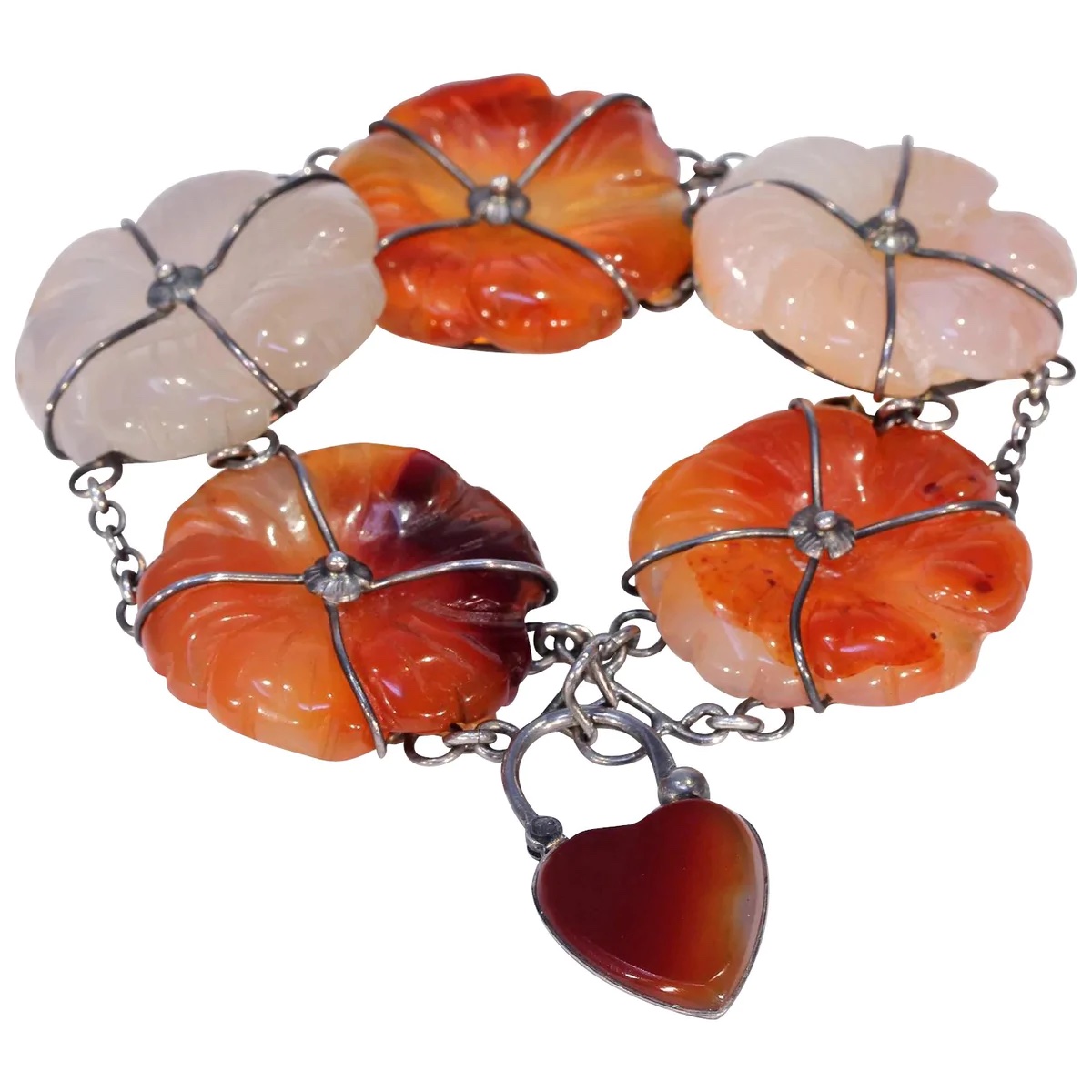 This bracelet is unusual in that most designs of the period used agate rods or ovals but this piece has carved flower heads. The heart lock was a common feature on a lot of bracelets of the time, here rendered with a cabochon cut agate.