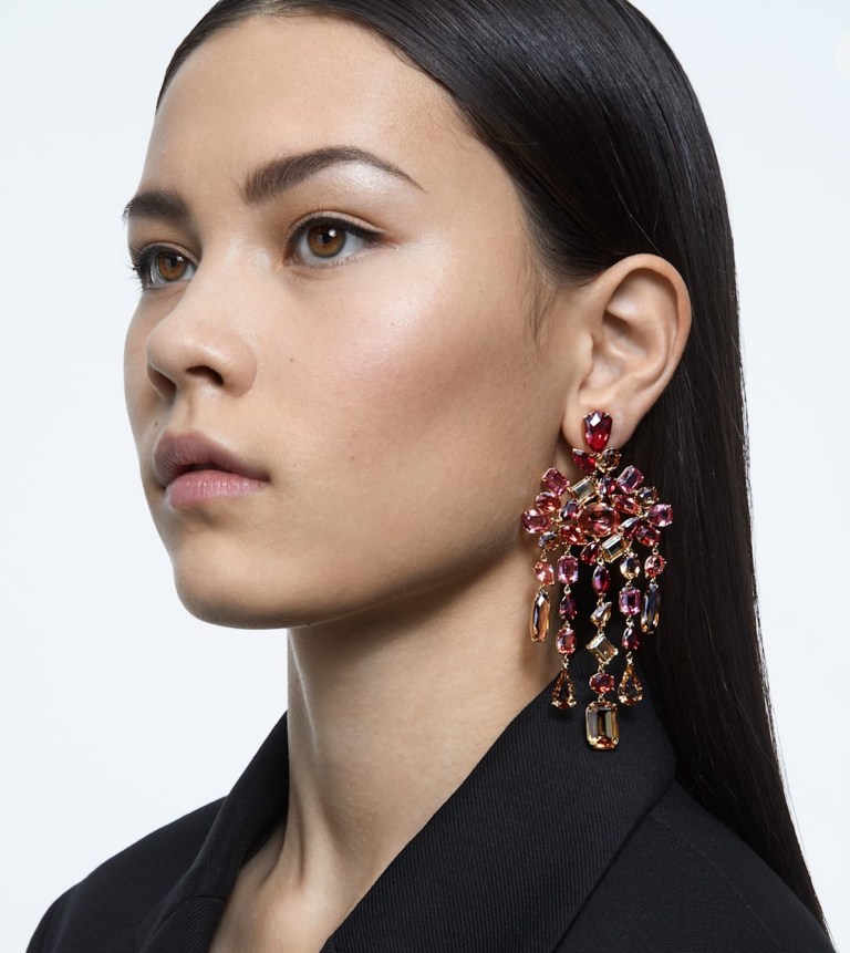 They note, “Expertly formed from a dazzling array of crystals in warm hues and mixed classic cuts, these chandelier earrings make the boldest style statement. Finished with gold-tone plated settings, team them with simple silhouettes, or amp up the drama for the evening by styling them with maximal pieces, for an unexpected look. These earrings are part of the Gema family, designed by Creative Director Giovanna Engelbert for Collection I.”