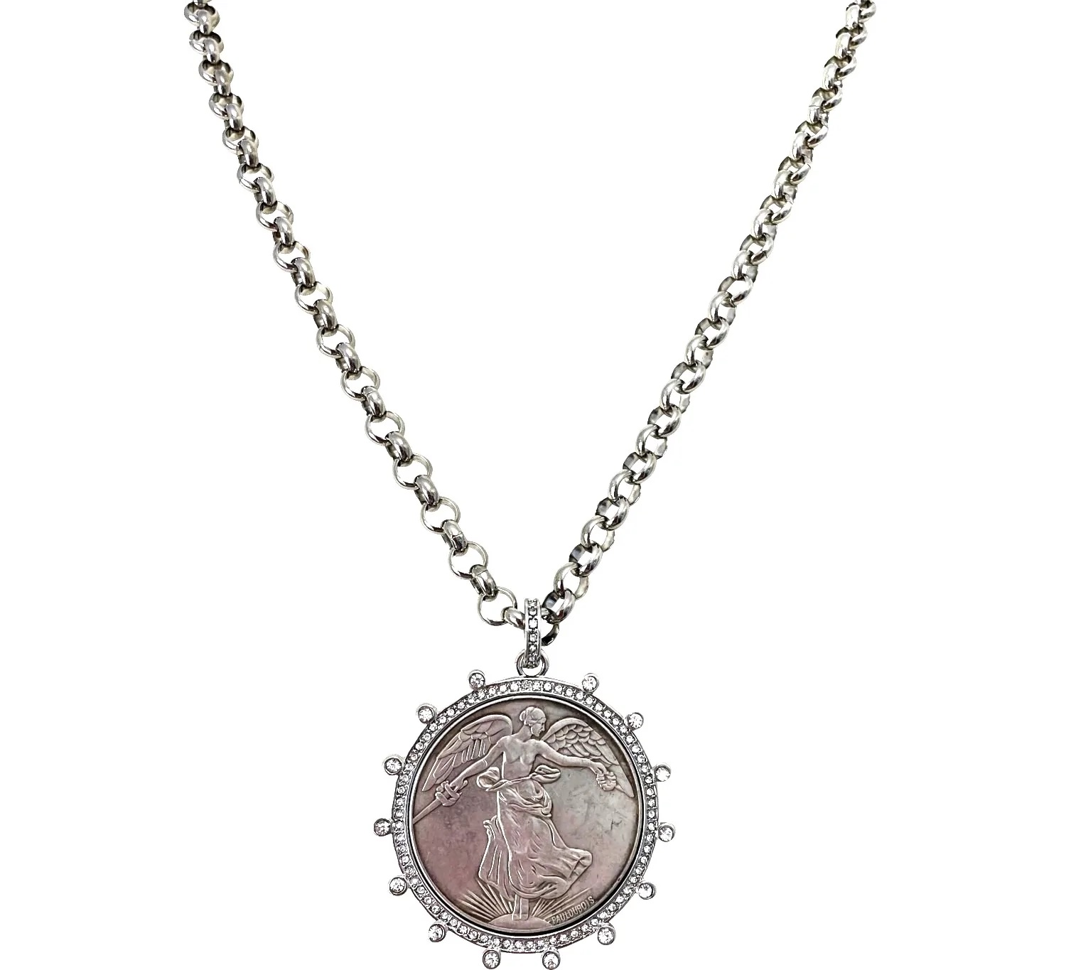 I have several pieces by Valentine Rouge, and really enjoy their designs. This plated necklace is part of their Louis Louis collection: “Echoing the inspiration of my muse, King Louis XIV, the “inventor of French high jewelry,” who transformed Versailles into a sparkling dazzling theater. Louis Louis confronts masculinity and femininity and displays a subtle representation of the French royal Louis period blended with today’s casual, contemporary, everyday vibe. Medallion coins are made in France and are direct replicas of coins past. The Victory Angel Coin features a beautiful design from medalist artist Paul Dubois, symbolizing victory and peace. The Victory Angel is carrying a sword and is on top of the sun with her protective wings in full bloom. She is strong and she is fierce, bringing the wearer strength and luck.”