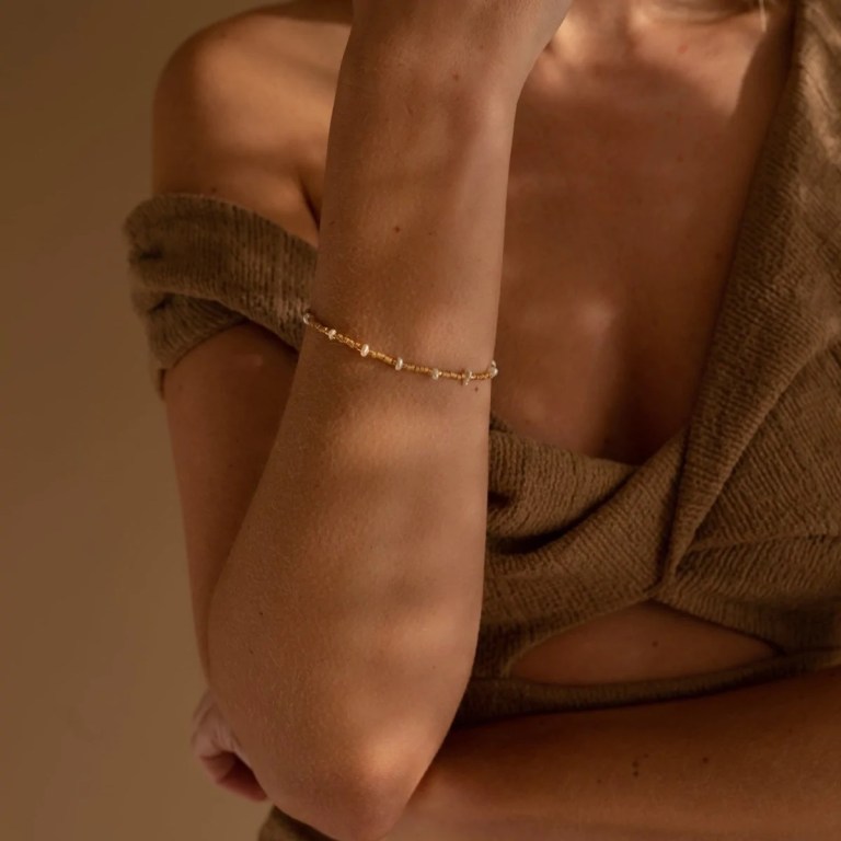 They note, “Designed for stacking, the Malibu bracelet features a string of white and contrasting miyuki gold glass beads interspersed with freshwater pearls. This adjustable design allows for effortless styling. Artisan-handmade this is a versatile and easy-to-wear stackable design that can be mixed and matched with others from the collection for a modern bohemian feel.”