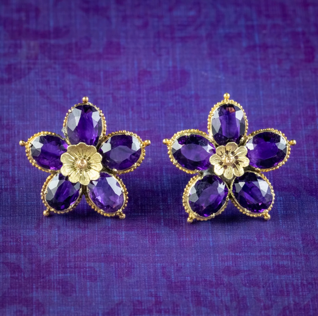 Seller Laurelle Antique Jewellery notes, “A pretty pair of antique Victorian flower earrings set with five deep purple amethyst petals (approx. 0.80ct each – 8ct total) with a small gold flower blooming out from the centre. ”