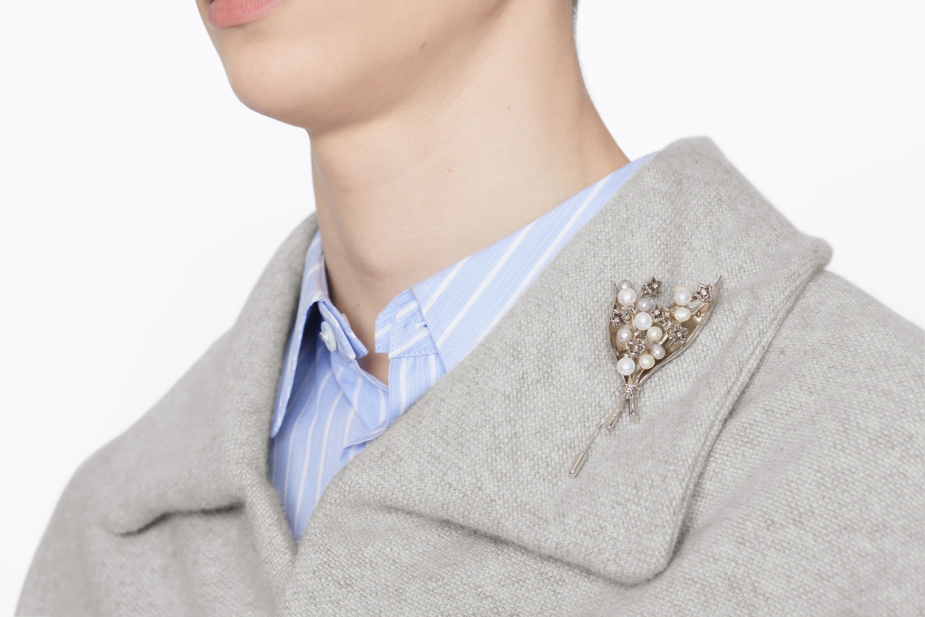 Also interesting to note that Dior placed this brooch in its men’s collection, as shown below. It is made with silver toned brass, set with freshwater grey and white pearls. There appear to be crystals as well, but that isn’t mentioned in the description.