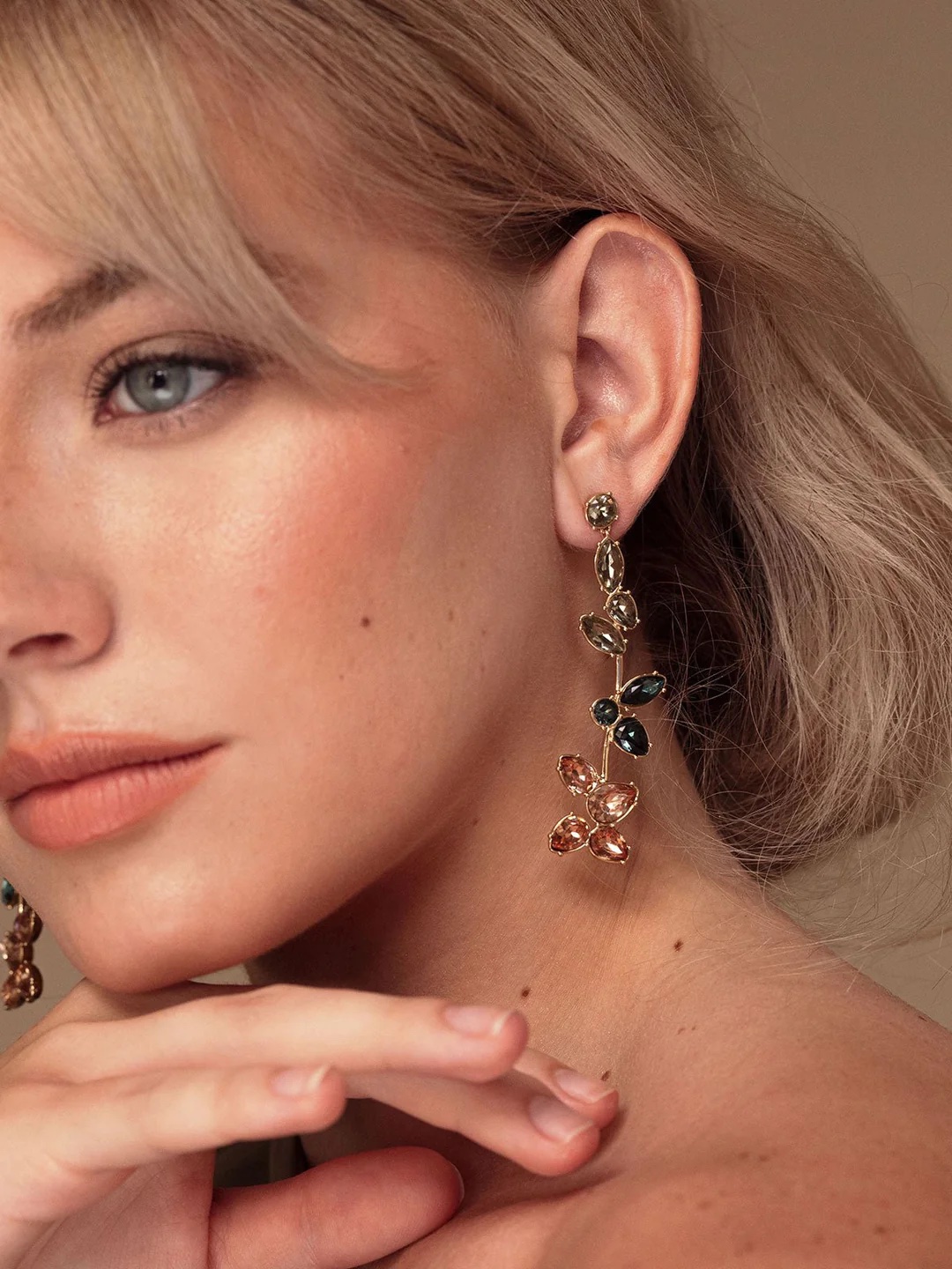These gold plated base metal earrings are set with glass crystals. Their description: An earring you haven’t seen before. This vine silhouette dangles from your lobes with cascading floral vibes and colorful crystals. Cue the compliments, because you’re sure to turn heads with every move in these beauties. Elevate your blazer for the office or glam up a slip dress.