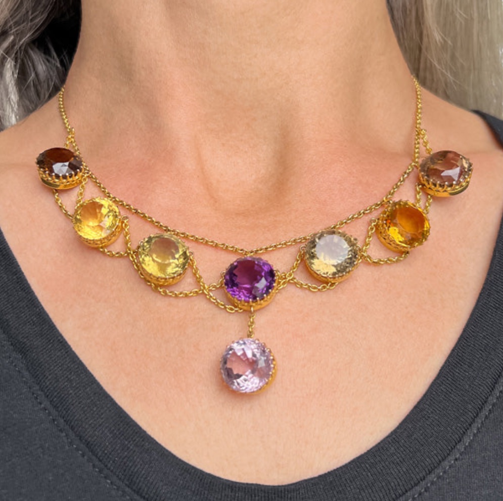 The festoon style of necklace, as seen here in this antique example offered by Doyle & Doyle, first became popular in the Georgian period, and it stayed fashionable into the Victoria era.