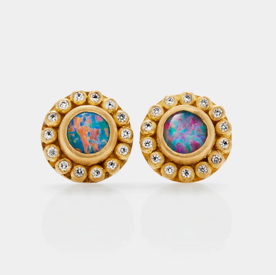 They use high karat gold, in this case, 20k in a colour they are calling peach. These earrings are set with round opals and pave diamonds.