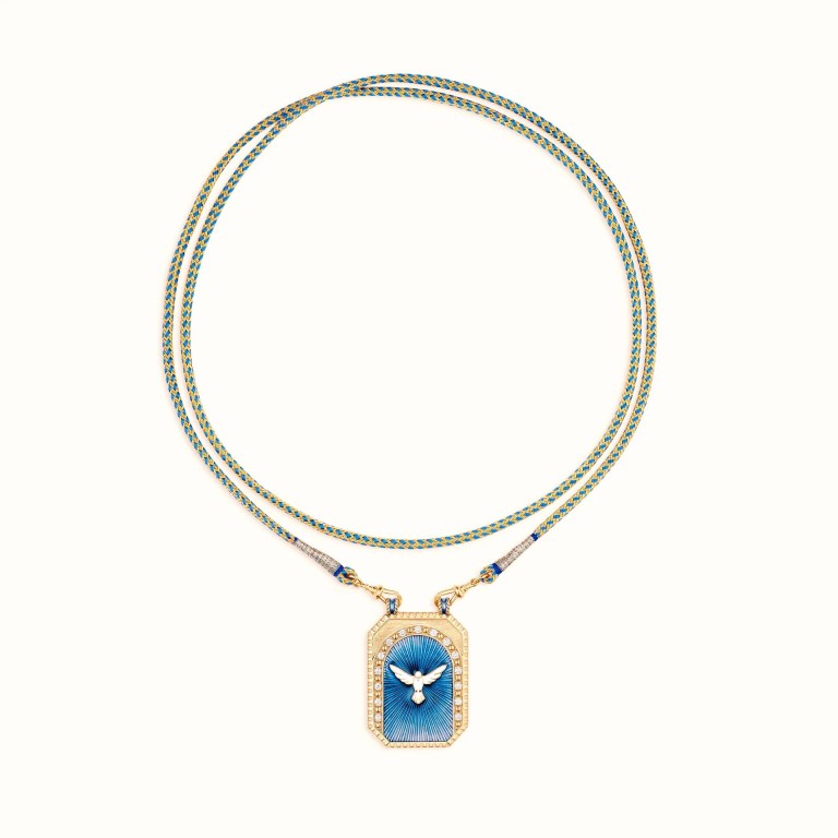This necklace by Marie Lichtenberg is part of her scapular collection. In Catholicism, scapulars are devotional items. Here, she focuses on peace (there are other themes in the collection), showing a dove rendered in enamel and accented with diamonds. Lichtenberg uses 18k gold, with the “chain” for this piece made of cloth woven with gold.