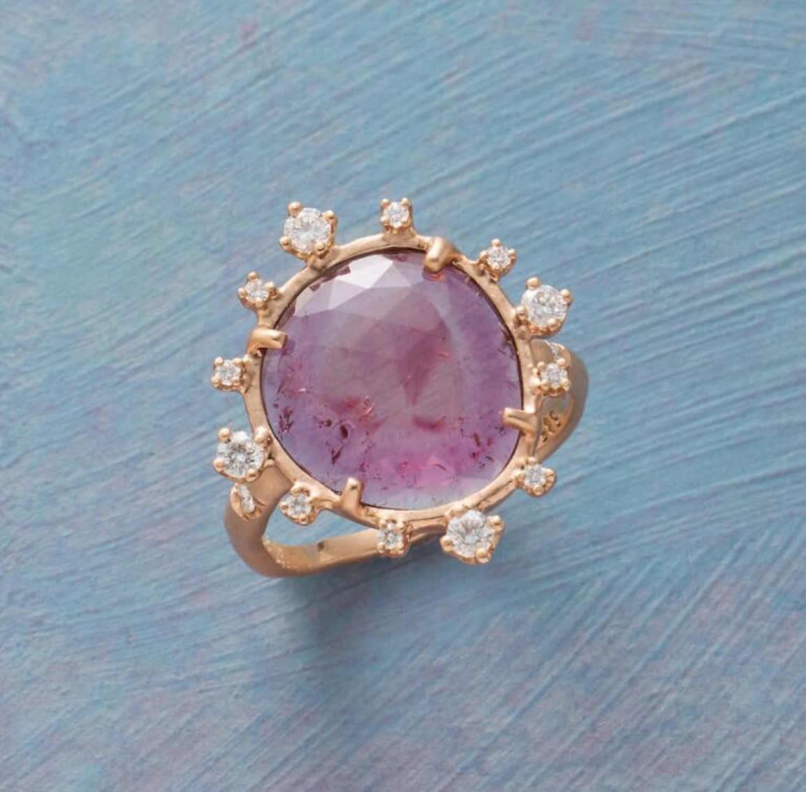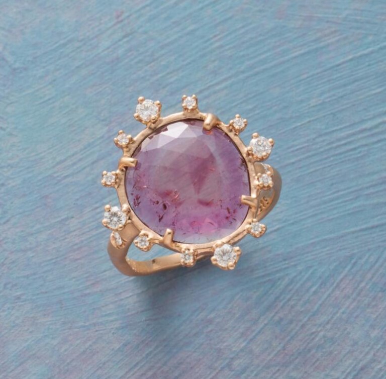 This ring by Christopher and Mai features a pink tourmaline stone as its focal point.
