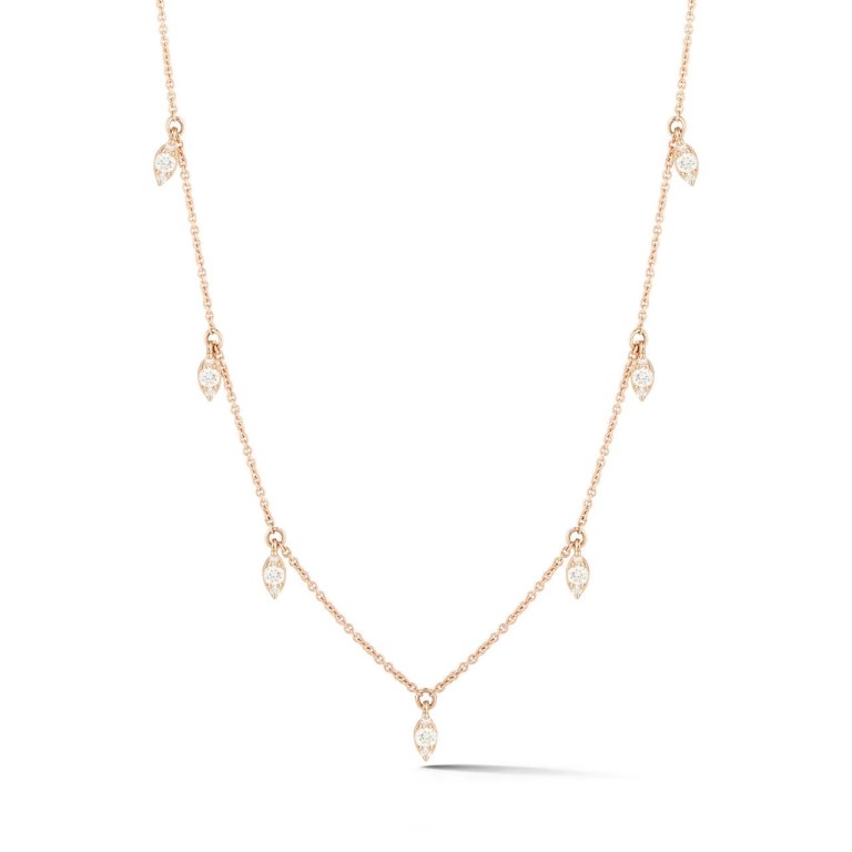 Their site says, “Station necklaces are quickly becoming a Dana Rebecca Designs jewelry box must-have! This Sophia Ryan Marquise Station Necklace is an office favorite, with seven diamond stations along a delicate gold chain. Each station is comprised of three round diamonds set together to create the illusion of a marquise. Dripping in a quarter-carat of brilliant diamonds, this gold station necklace is sure to be a head-turner. We love layering it with a classic bar necklace or pairing it with a long lariat for a modern take. The Sophia Ryan Marquise Station Necklace delights with subtle movement and maximum sparkle.”
