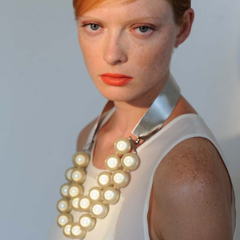 This oversize faux pearl necklace by Lucia Odeschalchi is effortless Italian cool. The interesting design features faux pearls hung on a stainless steel collar around the neck.