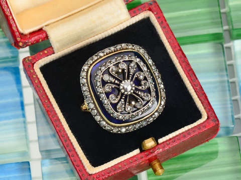 An unusual cushion shape was fashioned in 18k gold, silver, rose cut diamonds and that illustrious cobalt blue enamel, sometimes referred to as Bristol glass.