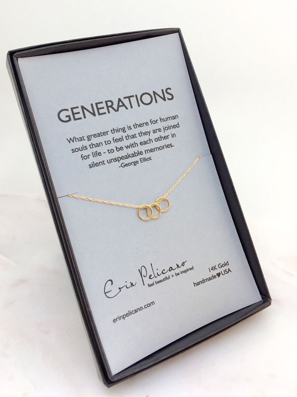 Erin Pelicano has some lovely options for sentimental jewelry. Here, their “generations” necklace. They note, “This generations necklace is a gorgeous gold symbol of generations of love. The gold generations necklace is 14k gold, chain carries multiple delicate gold rings that represent the bonds of family. Crafted delicately on a 16″ or 18″ gold chain. Presented on a Generations card, ” What greater thing is there for human souls than to feel that they are joined for life – to be with each other in silent unspeakable memories.”