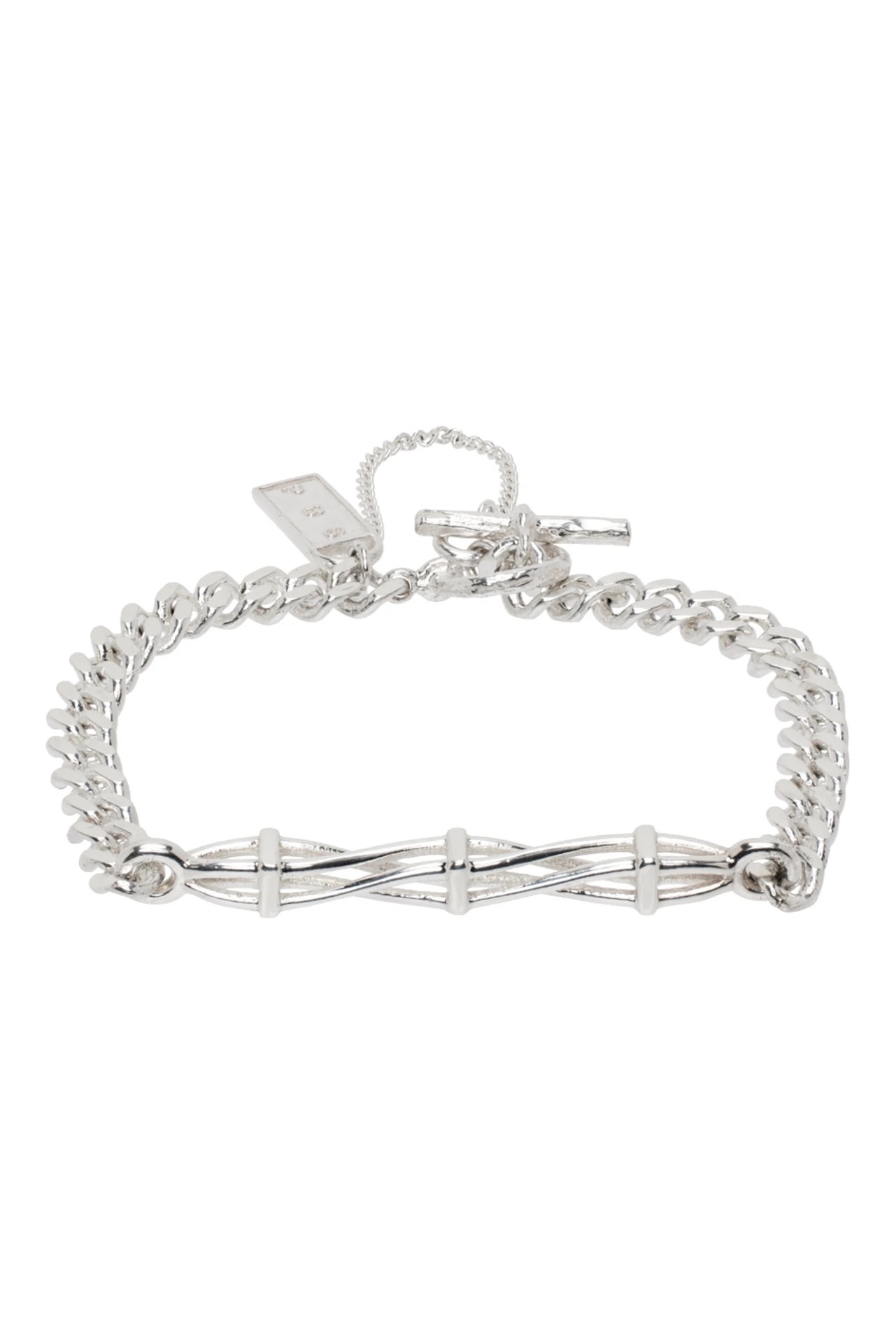 This sterling silver bracelet has traditional curb links on either side of a centre piece that looks almost like barbed wire. Interestingly, it has both a toggle and spring ring closure.