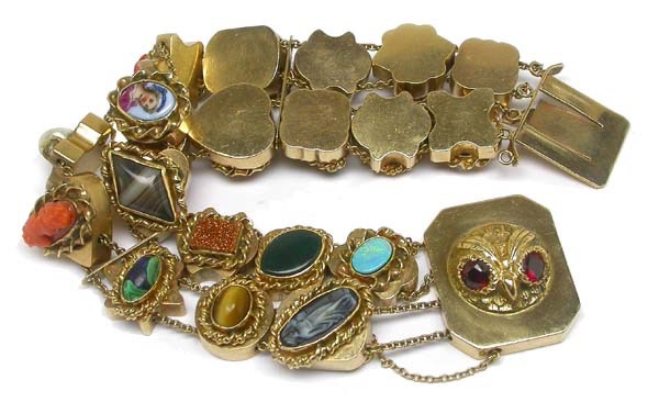This example from New York Estate Jewelry uses slides from the 1940s, when they were made specifically for this decorative purpose. It features various gem set slides and is 14k gold. It is priced at USD$5,100.