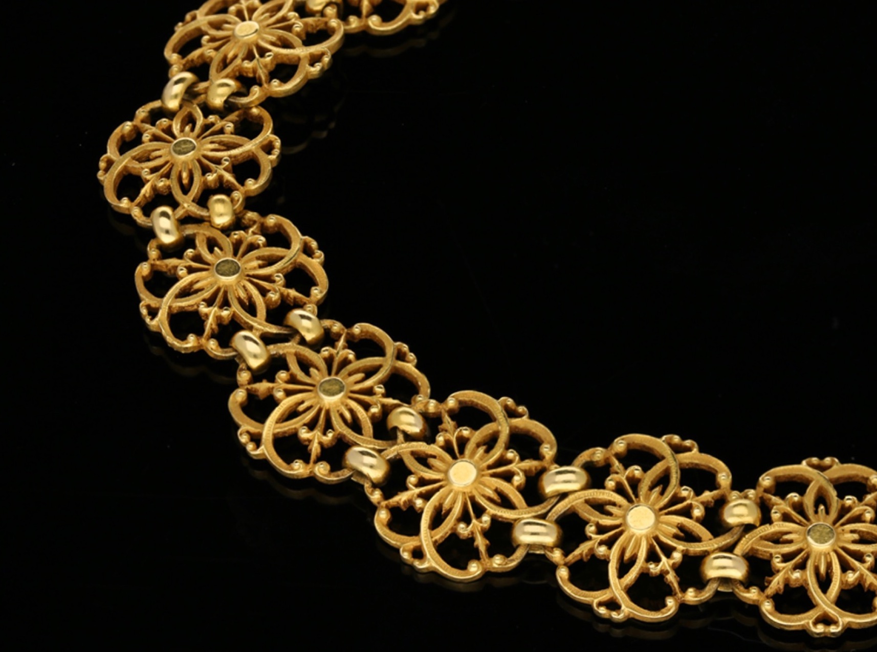 Gothic revival gold openwork bracelet by Wièse. A yellow gold articulated openwork bracelet, flowing with movement, composed of thirteen quatrefoil segments joined by oval links, featuring granulation details, polished borders and fancy pierced backholing, fitted with a secure integrated push clasp and safety chain, approximately 7.2” in length. Marked 18 carat gold, approximately 26.38 grams in weight, maker’s mark ‘Wièse’, French, circa 1885.”