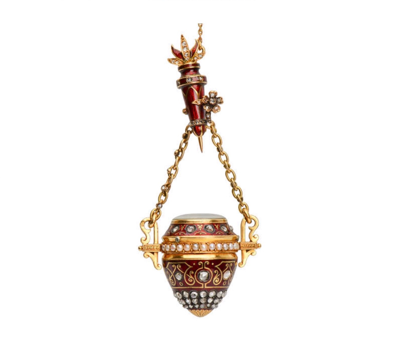 The detailed description on the web site notes, “A brooch, a pendant, a watch pendant, and together a pinnacle of the fine haute joaillerie or high jewelry of circa 1900. The motifs are the eternal flaming torch of love above, which likely represents, the urn that would smolder with ardor’s fire. Diamonds, natural saltwater pearls, exceptional enamel work, 18k yellow gold, and silver were the ingredients for this collector’s and wearer’s dreams. A flower with diamonds also adorns the love torch along with enamel. Neoclassical designs to the urn in champlevé enamel with a coppery orange hue add to the diamond and pearl work. A royal blue enamel dial serves as the watch face.