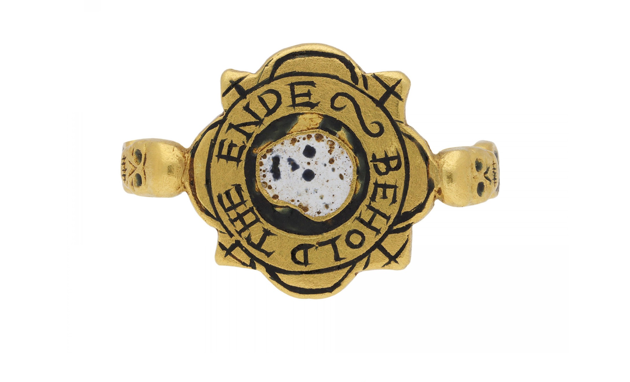 This Tudor era ring is offered by Berganza. They explain, “Tudor enameled ‘BEHOLD THE ENDE’ skull ring. Formed to centre with an irregular quartefoil bezel, featuring a horizontal white and black enameled skull encased in a circular black enameled background, surrounded by the inscription ‘BEHOLD THE ENDE’ and decorated by black enameled borders and cruciform motifs, flanked by intricately carved skulls on either side and black enameled flower motifs which lead down to a solid D–shapeshank. Tested gold, approximately 6.89g in weight, English, circa 17th century AD, accompanied by Oxford Labs X-ray fluorescence analysis report stating the composition of the metal.