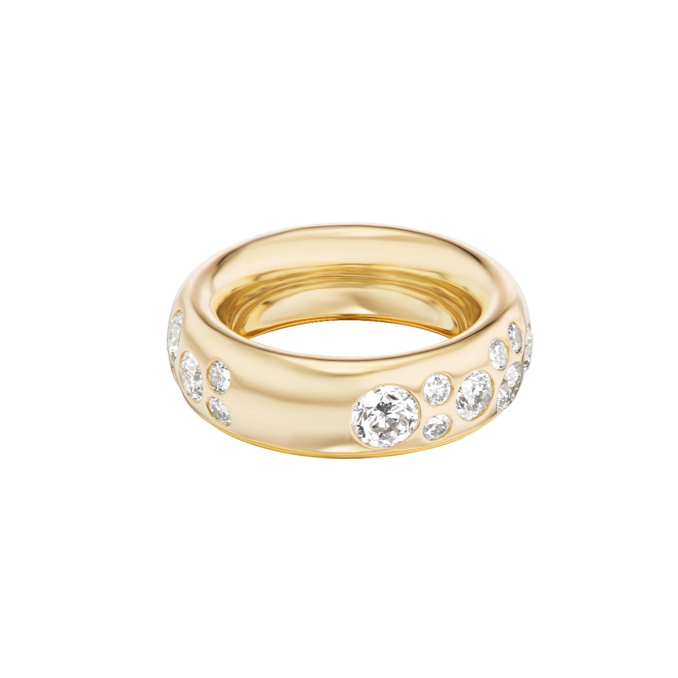 This ring by Uniform Object has that luscious look that buttery 18k yellow gold gives and it weighs 26.85 grams. It’s set with 2.16 carats of white diamonds in varying round cut sizes.