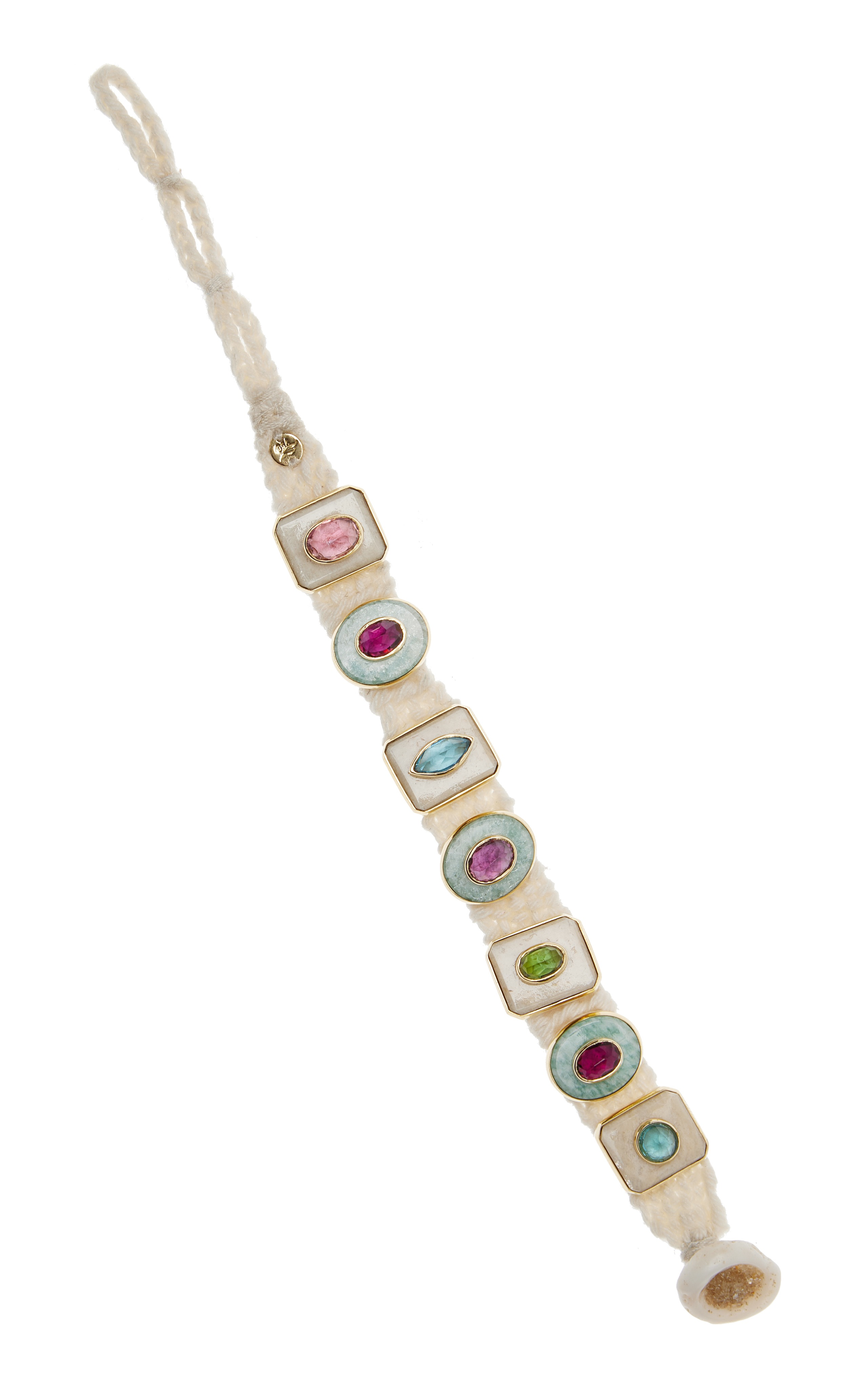 Here, a bracelet made with 18k gold, cotton, beige Amazonite 3.87 CT, pink tourmaline 0.9CT, beige Amazonite 3.72CT, Swiss blue topaz 0.65CT, green tourmaline 0,54CT, and another beige Amazonite 3.76CT.