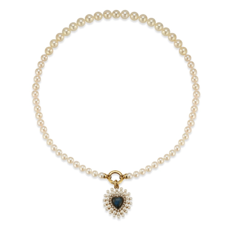 This pearl necklace by Storrow Fine Jewelry is a little bit sassy and a little bit sweet. The Akoya pearl strand is accented by a labradorite heart, set off by more pearls. The findings are 18k yellow gold.