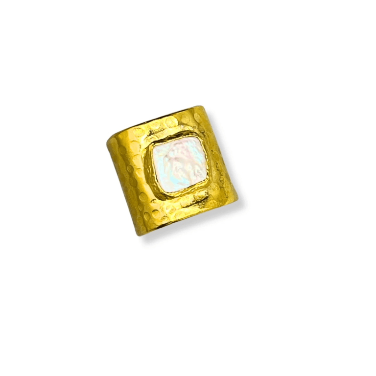 This ring is made of gold plated brass set with a square piece of pearl (possibly mother of pearl, but the description says otherwise).