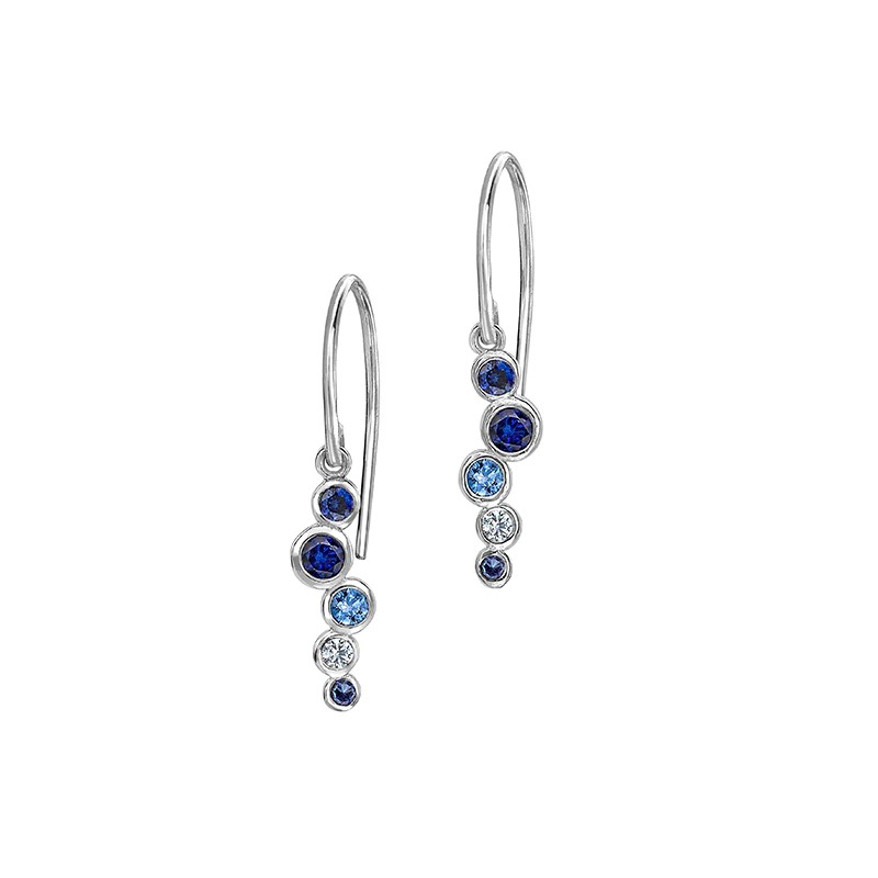 They note,” Luxuriously handcrafted in 18ct white gold, these elegant Cascade earrings feature a delicate waterfall of blue sapphires and aquamarines. The gemstones are encased in fine rub-over settings in an ombre colour combination and suspended from contemporary ear wires. Made with recycled gold. Total length – 26mm. Stones total 0.33ct.“