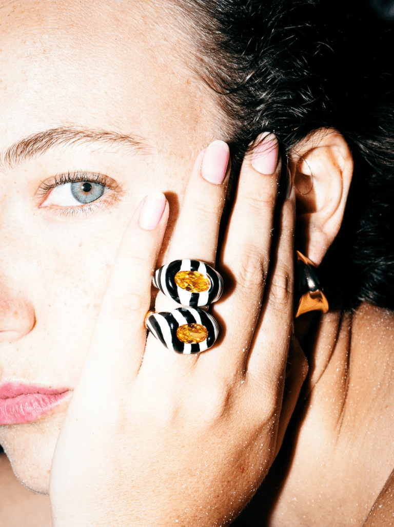 Highline Jewelry offers a playful array of colourful pieces. Here, a painted and enameled ring in a zebra pattern, set with cubic zirconia. It’s shown here as a pair of rings so despite being chunky, they can actually be stacked.