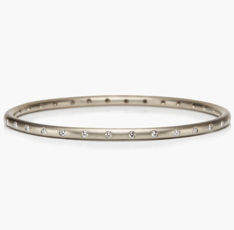 Here, their hoop stock bangle bracelet in 18k white gold (they call it alpine gold). Total diamond weight is not indicated.