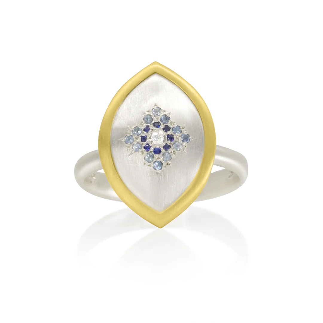 It features satin finished white gold surrounded by a yellow gold frame (both 18k), with a sprinkling of diamonds, aquamarines and sapphires in the centre.