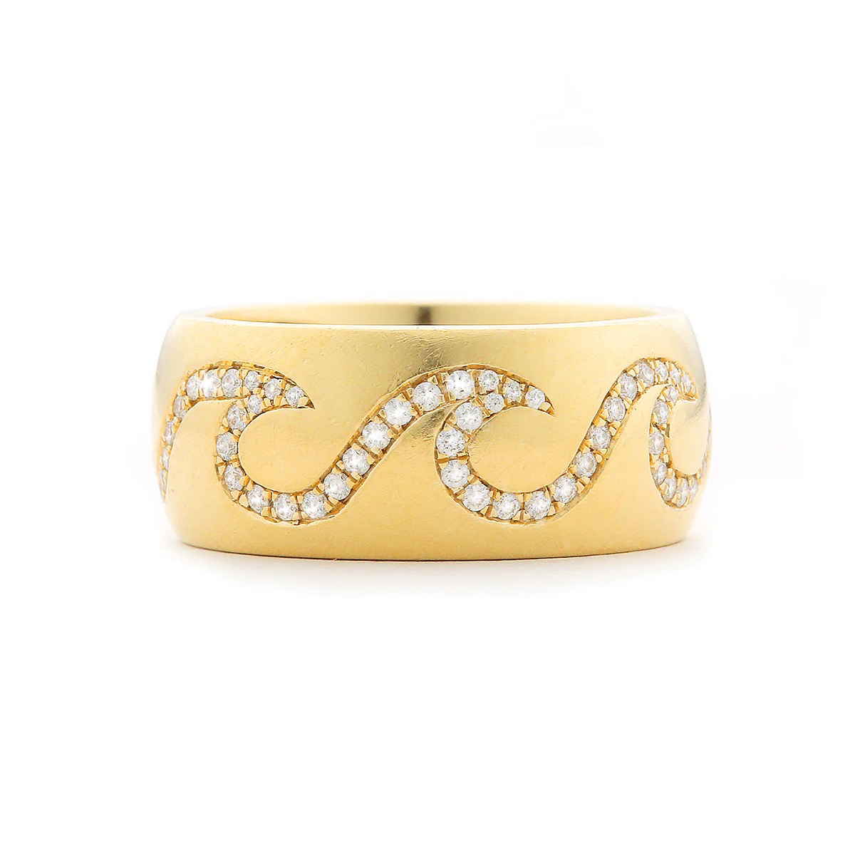 It’s made of 18k yellow gold set with diamonds in a wave pattern; total diamond weight is not indicated.