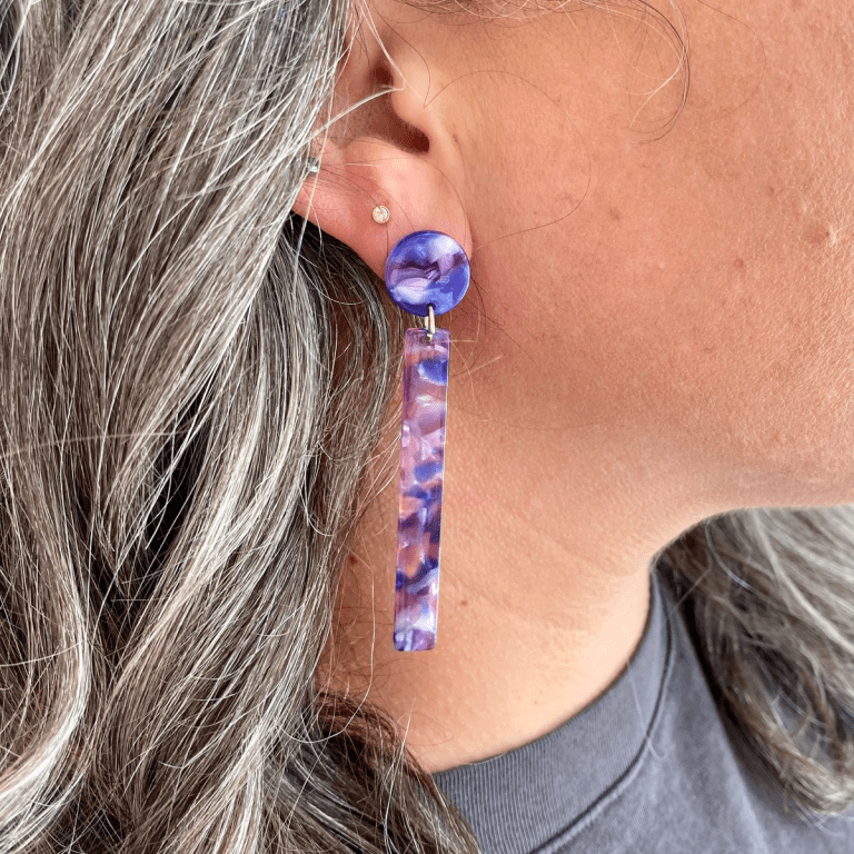 These drop earrings are purple with some hints of blue and red. They are three inches long and a quarter of an inch wide, with brass posts.