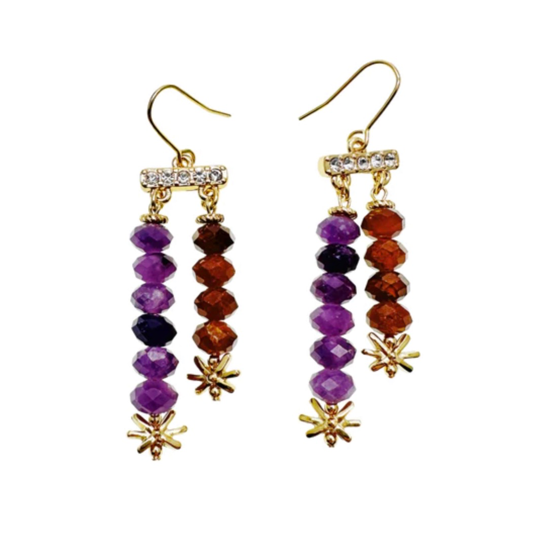 There isn’t much info about these earrings from Farra. They use two strands of amethyst and garnet beads; the type of metal is not specified but I’d guess brass or perhaps gold plated silver?