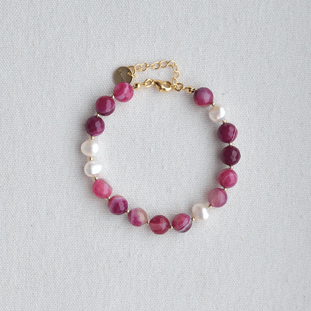 This bracelet uses agate beads (and presumably freshwater pearls, though it isn’t stated) to pretty effect. Findings are gold plated brass.