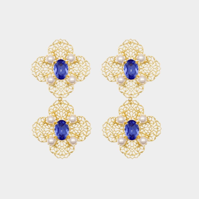 These earrings, dubbed the Rebecca, are described as featuring “the signature filigree flowers of our Riviera collection, along with colorful crystal and vegan pearl accents. These earrings are the perfect summer accessory, giving massive Dolce Vita vibes. Handmade in small batches from gold-plated brass and premium crystal, and designed and hand-set in our Australian studio, you’re purchase is supporting a local female-owned business that values people and the planet.”