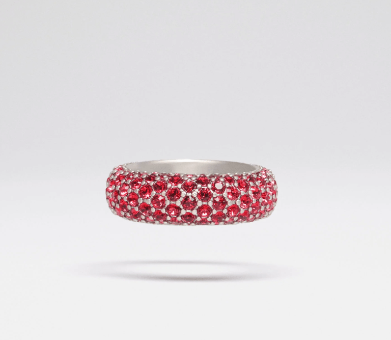 Slightly domed, it’s made with crystals(and available in an array of colours) and silver plated brass. It’s available for USD470.