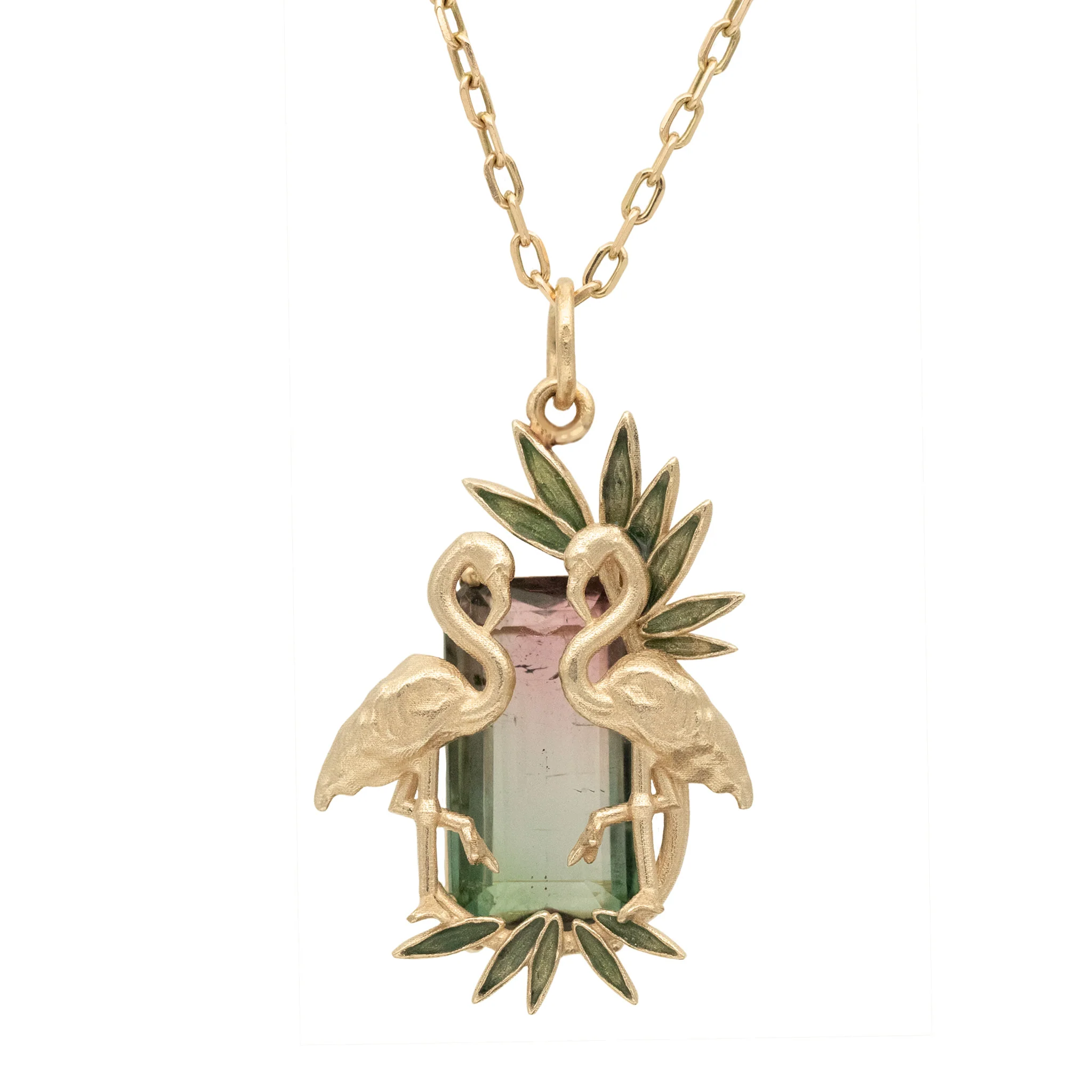 It shows two flamingoes flanking a watermelon tourmaline; the setting and chain are 9k yellow gold.