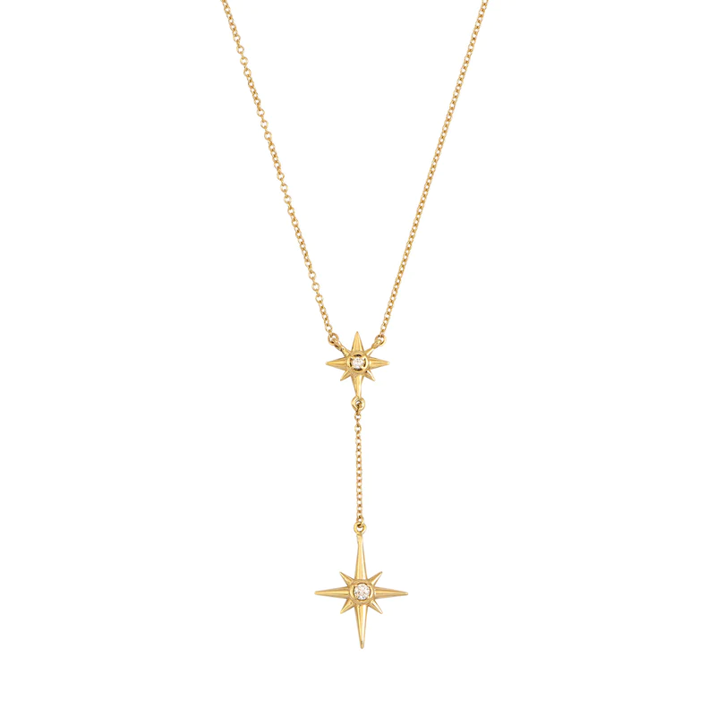Their site notes, “This elegant and delicate North Star pendant is from a new collection of Guiding Stars with designs inspired by our ever-popular True North charms. A larger star hangs on chain below a smaller one, both handmade in 14ct yellow gold star and claw set with diamonds. Made with recycled gold. Total diamond weight – 5pt (F SI quality). Pendant length – approx. 42mm.”