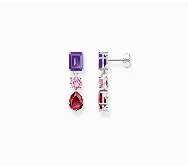 These earrings are a case in point. They are done in sterling silver, using amethyst-coloured zirconia, synthetic corundum red, and pink zirconia stones to elegant effect.