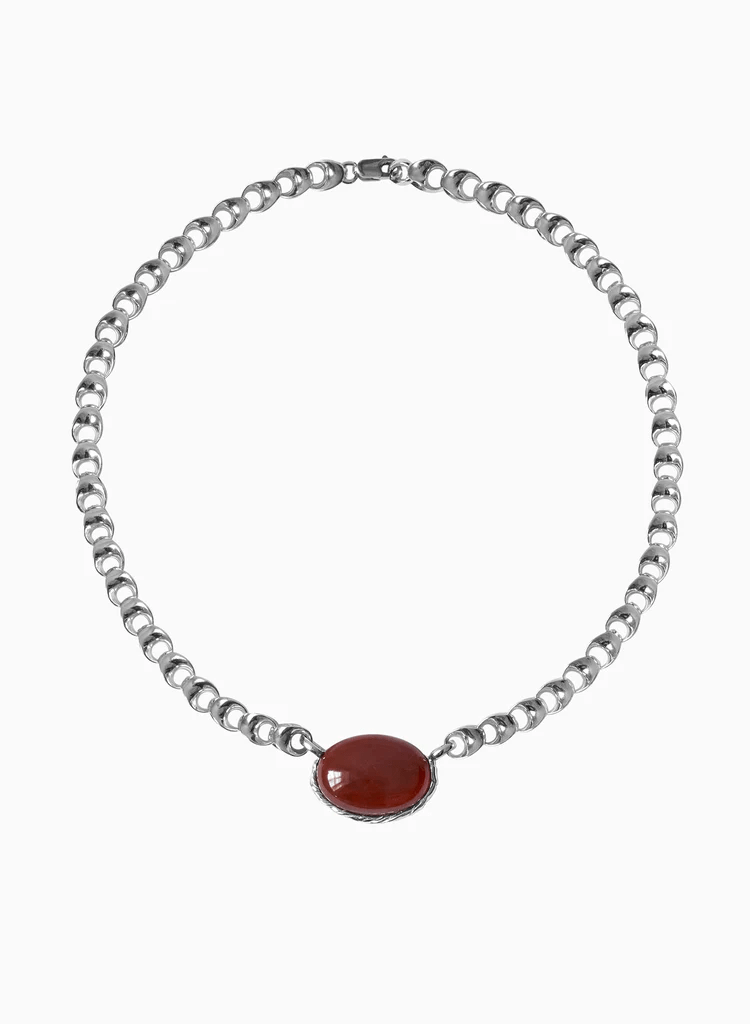 They describe this made to order piece as, “Sterling silver chain necklace assembled with our embleme pendant featuring a large carnelian stone.”